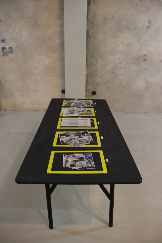 Images de la presse algérienne triées en 5 catégories, scotch jaune, étiquettes sur table noire.
